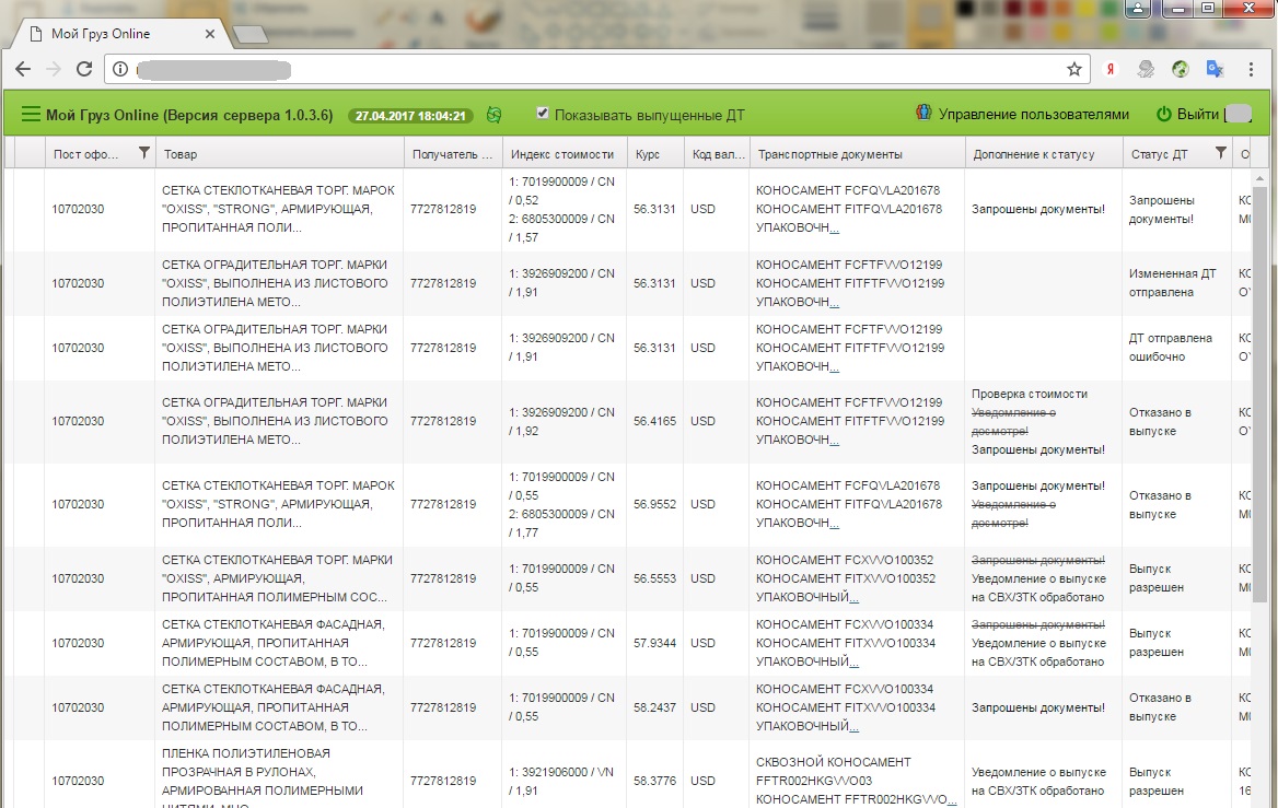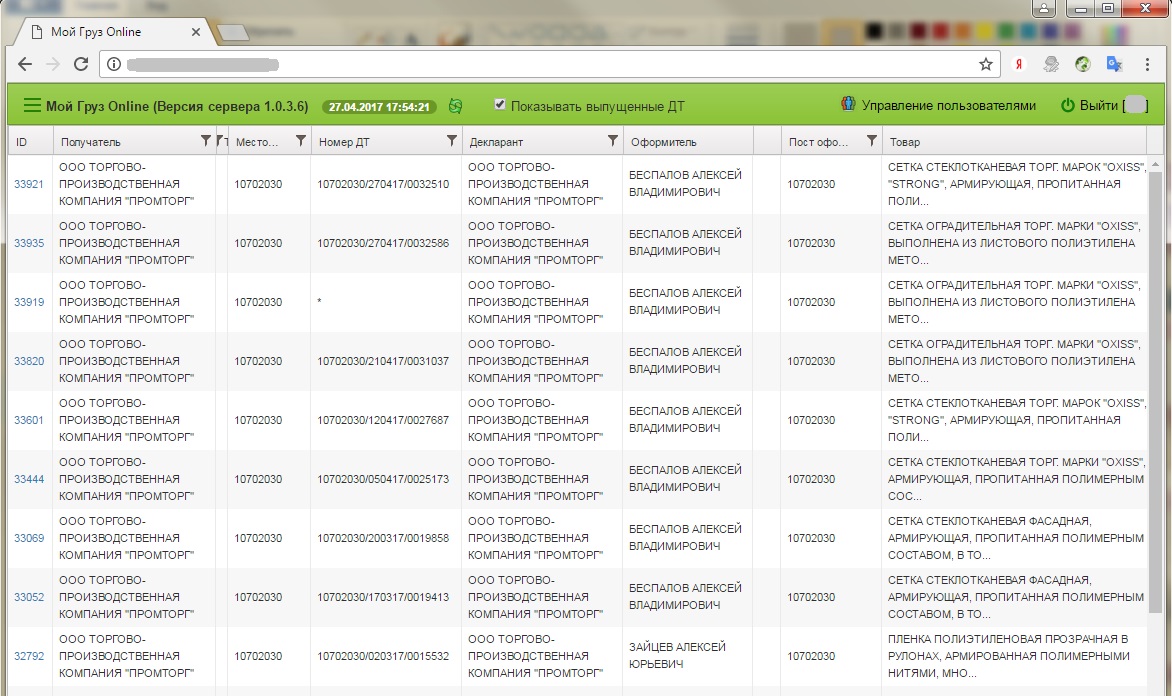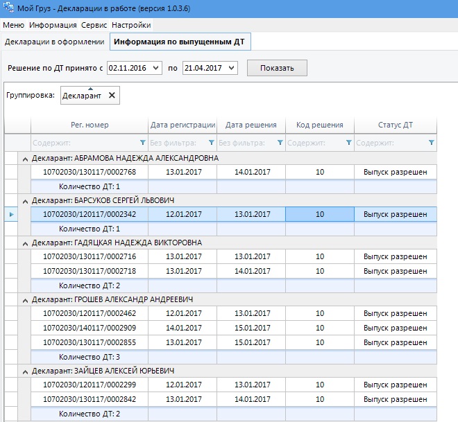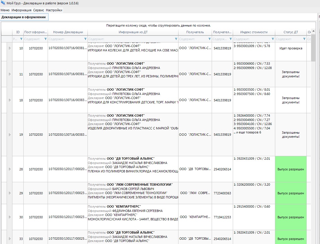 Клиентская часть программы представляет собой список из строк, в котором каждая строка - информация о декларации: номер ДТ, информация, характеризующая ДТ (отправитель, получатель, товар), текущее состояние процесса оформления ДТ, дата последнего статуса, имя инспектора, который работает с ДТ и т.д. Порядок столбцов с нужной информацией настраивается.