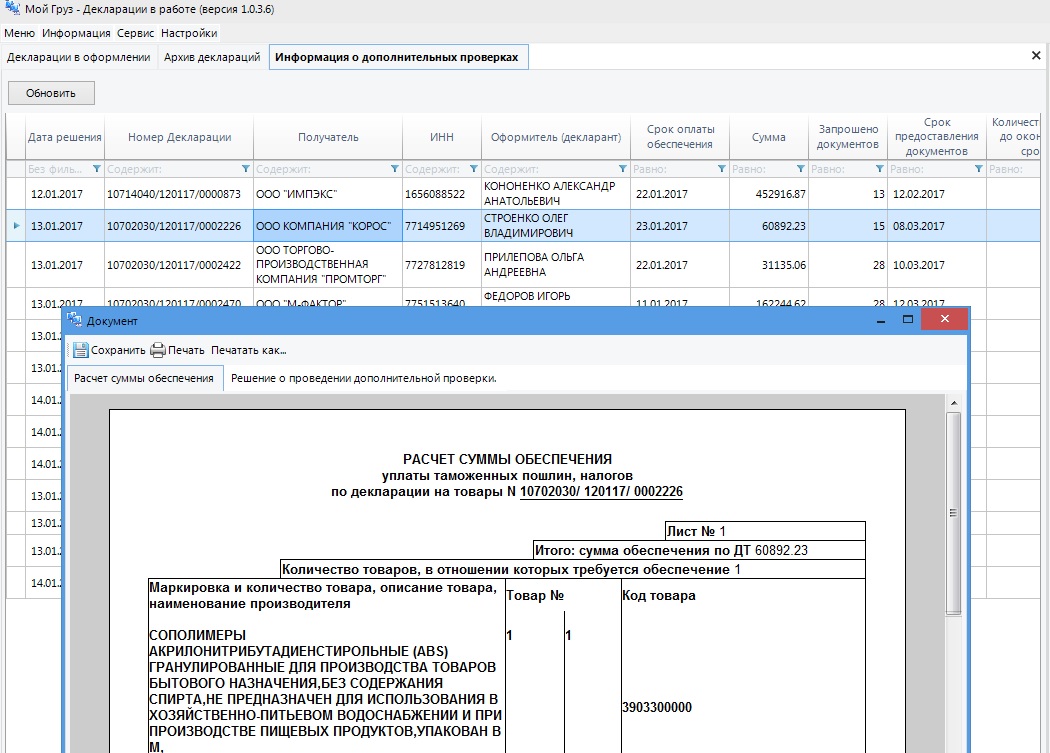 В отдельной вкладке формируется список деклараций, по которым выставлены дополнительные проверки. Чтобы посмотреть более детальную информацию по дополнительной проверке достаточно сделать двойной клик на конкретной ДТ: