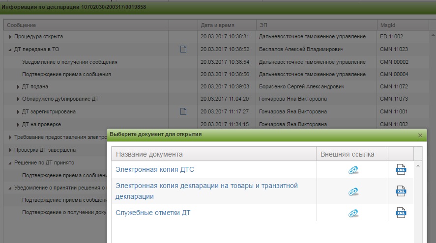 По каждой декларации можно открыть журнал сообщений, а также просмотреть ключевые документы: